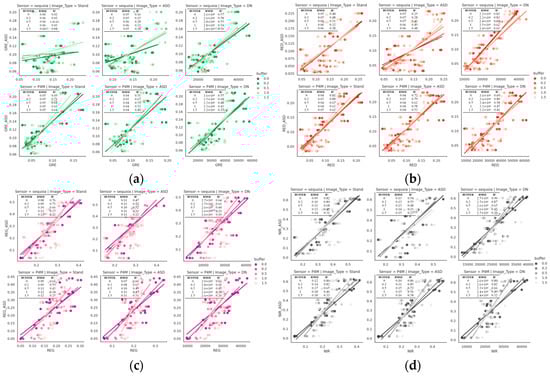 Figure 10(1a,2a) detail the Pearson coefficients and NRMSE for all data pairs and for different correction types in each band and vegetation index. The results indicated lower correlations and higher NRMSE for uncorrected (DN) data, especially in the CLre band, where correlations approached zero and the RMSE exceeded 500%. However, in the REG and NIR bands, uncorrected data correlations surpassed those of corrected images and exhibited lower NRMSE. The ASD-corrected images generally exhibited higher correlations and lower RMSE than those corrected using standard reflectance (Stand), with negligible differences observed in various vegetation indices.
