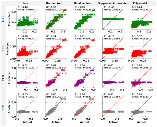 Based on the accuracy comparisons, the DJI Phantom 4 Multispectral (P4M) drone was selected as the target for sensor data conversion. For this purpose, data corrected using the standard reflectance (Stand) method with buffer zones of 0 and 0.2 m were selected to develop the conversion models (Figure 13). Among the various modeling approaches tested, decision tree and random forest regression models demonstrated superior effectiveness in converting band values between the sensors, achieving R2 values ranging from 0.86 to 0.91. However, the accuracy of conversions using linear regression and polynomial fitting methods was found to be subpar across most bands. Notably, only in the RED band did these methods achieve relatively higher accuracy, with R2 values reaching 0.28 and 0.32, respectively. The fitting results from support vector machine regression were also unsatisfactory for all bands.