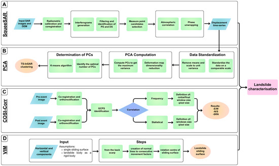 Simplified flowchart of the three techniques applied in the work: SqueeSAR (A), Principal Component Analysis (B), COSI-Corr (C), and Vector Inclination Method (D). The outcomes of these analyses are used for the landslide characterization.
