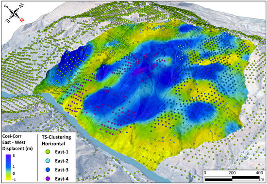 The result of the analysis of the optical images acquired by Sentinel-2 and processed using the COSI-Corr algorithm with the 128-64-pixel combination is presented in Figure 5. The result was subjected to a non-local mean filter, which exploited the signal-to-noise ratio, one of the outputs of the processing. This methodological approach permitted the elimination of the excessively noisy displacement component, which was primarily caused by disparities in shadowing between the two selected scenes. In Figure 5 presents the results of both the COSI-Corr and InSAR TS-clustering for the east–west component, which is the primary component of landslide displacement. In consideration of the approximate six-year time baseline between the two Sentinel-2 scenes (26 July 2016–29 August 2022), it is reasonable to consider that the COSI-Corr displacement measurements are less precise than the more accurate InSAR measurements. The COSI-Corr measurement is subjected to decorrelation due to a phenomenon that is primarily attributable to seasonal variations or the proliferation of vegetation. The hypothesis is substantiated by the standard deviation of the COSI-Corr displacement measurements of 0.81 m, which indicates the margin of error in the displacement measurements. The signal-to-noise ratio (SNR), a measure of correlation quality, is also computed using the COSI-Corr function. It is evident that outcomes exhibiting enhanced dependability are associated with SNR values that approximate unity [67]. The mean value of the signal-to-noise ratio (SNR) over the Baipaza landslide, as determined by the COSI-Corr outcome, is approximately 0.98, indicating a high degree of reliability and consistency (see the SNR map in Appendix A, Figure A1K). However, the most notable aspect is the increased spatial coverage of the deformation, which provides additional information about the displacement of the landslide.
