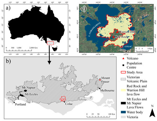 (a) The location of the Victorian Volcanic Plain (VVP) in Australia, (b) the study area and other volcanoes’ locations in the VVP, (c) the study area (red polygon) in relation to the Warrion Hill and Red Rock volcanoes.