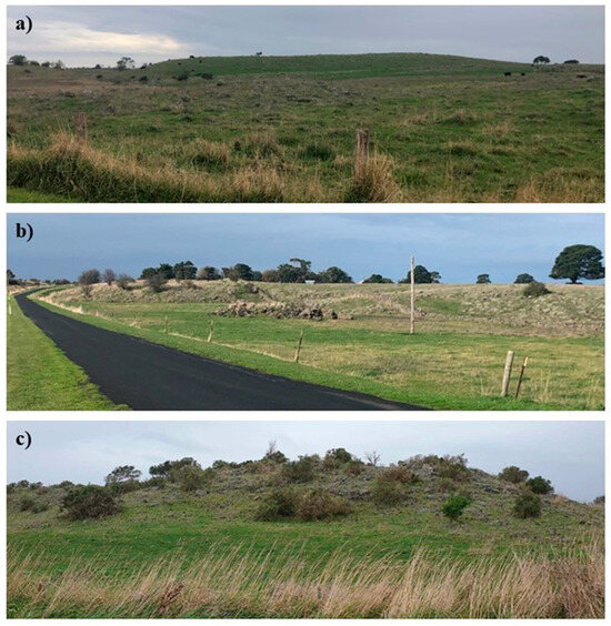 A selection of stony rises from the Warrion Hill and Red Rock lava flows: (a) a large stony rise with cattle grazing on its slopes; (b) a collection of stony rises covered in large, exposed basalt boulders with a drystone wall following the ridgelines; (c) a stony rise covered in vegetation.