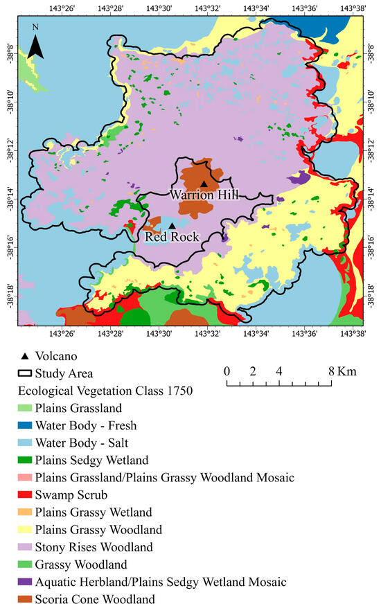 The climate of the Corangamite Basin has warm and dry summers and cool and wet winters [16], with an average annual rainfall of approximately 720 mm [48]. The native vegetation of the study area and its surrounds (Figure 3) comprises 12 vegetation classes dominated by Stony Rises Woodlands and Plains Grassy Woodlands.