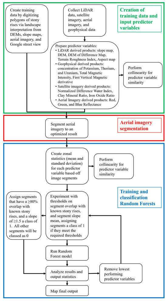 The overview of the methodology is shown in Figure 4. Following a similar approach to Fraser et al. [8], the methodology is broken down into the creation of training data, preparation of input predictor variables, image segmentation, and training and classification of stony rises using a Random Forest classifier. The details of each of these steps are briefly described in the following sections.