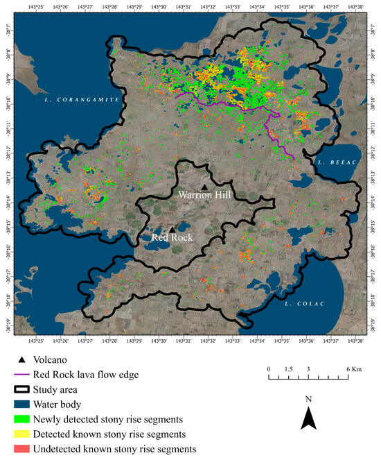 This research applies the technique utilized by Fraser et al. [8] to map stony rises at a landscape scale across the Warrion Hill and Red Rock Volcanic Complex lava flows (see Figure 1c) in the vicinity of Colac, Australia. This is the first time that machine learning using remotely sensing data has been applied to map stony rises in this area and the first time the approach has been used to map an entire lava flow. This is a significantly larger study area than the previously mapped Mount Fraser lava flow [8] and contains numerous younger (~42,000 years old) well preserved stony rises, with different physical characteristics. The remote sensing data available across this study area is not temporally coincident with that used in Fraser et al. [8]. The results will provide important information about the distribution and nature of stony rises in this vicinity as well as offer insights into the transferability and scalability of machine learning utilizing remote sensing to map stony rises across different natural landscapes.