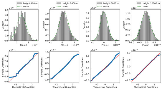 Histograms (upper row) and Q-Q plots (bottom row) of signal values at different from CL51-1 on March 2020 at midnight under clear sky conditions. The red line in Q-Q plots denotes the ideal normal distribution.