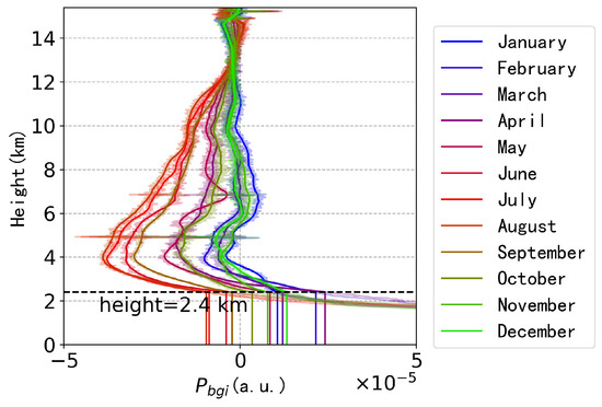 is a non-negligible bias which leads to serious negative values in ceilometer signal. Although aims at emphasizing the cloud base height and facilitates clearer cloud base height detection, it occasionally renders the backscattering signals of thin clouds negative, making backscattering signals unavailable at high altitudes. In the aerosol profile retrieval, introduces a non-negligible error that must be removed. value varies with the atmospheric background signal, thus shows significant diurnal differences characteristics. After the determination of , is calculated as a constant for every measured profile in this study. According to Kotthaus et al. [14], is estimated as the mean value of minus between 7 and 9 km without clouds.