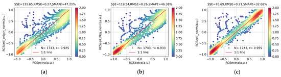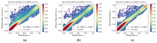 Scatter plots of paired range-corrected signals measured by the Vaisala CL51 ceilometer (RCSceil, y–axis) and the lidar (RCSextra, x–axis). Each profile is normalized to a range of −1 to 1. (a) Original CL51 signal compared with lidar data; (b) background-corrected CL51 signal compared with lidar data; (c) CL51 signal after both background and water vapor corrections compared with lidar data.