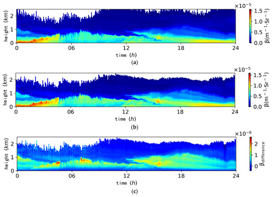 From Figure 11a to Figure 11b, it is evident that the signal correction procedure alters the overall backscattering coefficient profiles, especially in regions with the highest backscattering coefficient values. Compared to Figure 11a, the profiles in Figure 11b exhibit an enhancement in the aerosol accumulation region, a pattern also observed in Figure 11c. The most significant difference between the retrieved backscattering coefficients with and without signal correction occurs in aerosol-rich areas.