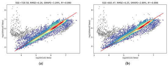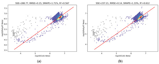 As shown in Figure 13, after applying the water vapor correction, the data points are more evenly distributed around the 1:1 line, with the line directly passing through the center of the dense data zone. R2 increases from 0.567 to 0.612, and all the error metrics significantly decrease with the water vapor correction procedure. Most of the data points are concentrated within the range of 6 to 7, corresponding to a backscattering coefficient in the order of ~10−7. The water vapor correction procedure effectively compensates for the absorption of the ceilometer laser at 910 nm caused by water vapor.
