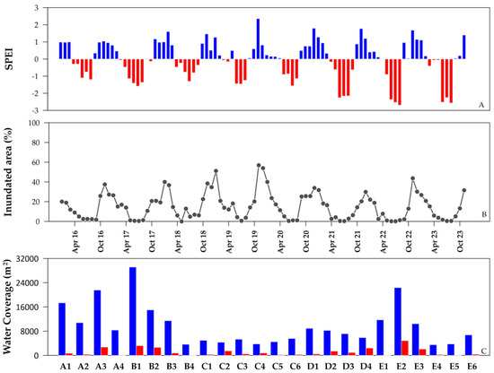 (A) Monthly SPEI values from April 2016 to October 2023, where red bars represent negative values corresponding to dry periods, while blue bars represent positive values corresponding to wet periods. (B) Percentage of the wetlands’ inundated area with respect to the total wetland area. (C) Average water coverage (m2) for each pond during the winter (blue bars) and summer seasons (red bars).