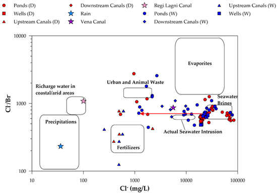 Cl−/Br− molar ratio vs. Cl− plot. The red arrow indicates the mixing line among saltwater and freshwater end-members, while rectangular boxes are reported from Alcalà and Custodio [18]. Circles refer to pond samples; squares refer to well samples; triangles refer to upstream canal samples, and rhombuses refer to downstream canals. Red symbols and (D) refer to dry period data, while blue symbols and (W) refer to wet period data. The stars refer to the rain (light blue), Vena Canal (Violet), and Regi Lagni (Pink) end-members.