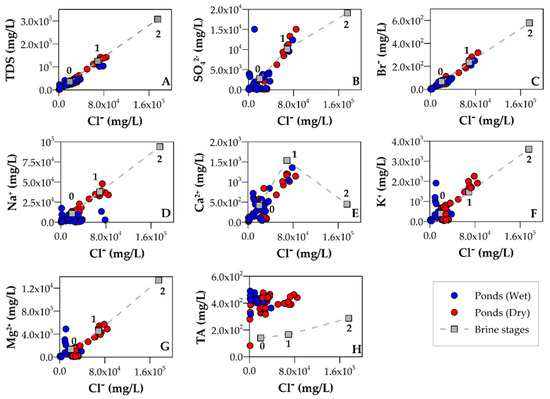 (A–H) Scatter plots of major ions and TDS vs. Cl− (mg/L) used as an indicator of evaporation. Numbers represent the brine stage level. Grey squares represent the concentration values of the different ions for the corresponding brine stages reported by Fontes and Matray [60]. Blue circles refer to the ponds’ samples of the wet period, while red circles refer to the ponds’ samples of the dry period.