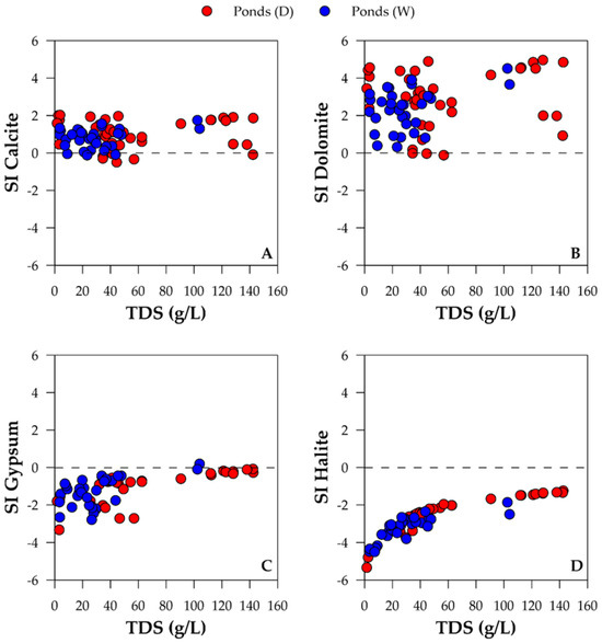 Scatter plots: (A) calcite saturation index vs. TDS (g/L); (B) dolomite saturation index vs. TDS (g/L); (C) gypsum saturation index vs. TDS (g/L); (D) halite saturation index vs. TDS (g/L). Blue circles refer to the ponds’ samples during the wet period, while red circles refer to the ponds’ samples during the dry period.