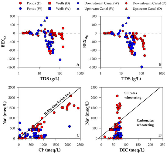 Scatter Plots: (A) BEXCa vs. TDS; (B) BEXMg vs. TDS; (C) Na+ vs. Cl−; (D) Na+ vs. DIC. Blue circles refer to the ponds’ samples during the wet period, while red circles refer to the ponds’ samples during the dry period.