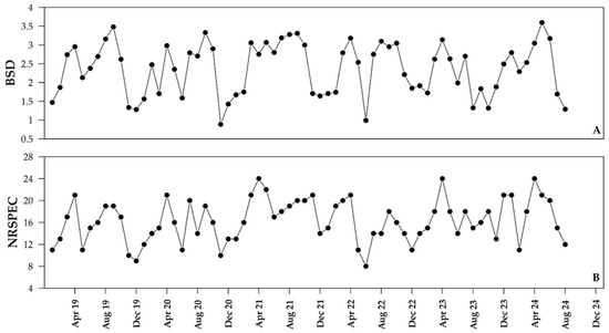 BSD and NRSPEC showed consistency with hydrochemical and climatic monitoring (Figure 7). The highest values of BSD and NRSPEC were found in the dry period when the brines were fully concentrated, and the water content of the area was significantly lower. Moreover, since 2022, a drop in August’s BSD and NRSPEC values has been detected compared to previous years.