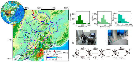 (a) Tectonic background of the study area and distribution of the gravity-monitoring network. CBV: Changbaishan volcano group; JBHV: Jingpo Lake volcano group; WDLCV: Wudalianchi volcano group; F1: Yilan-Yitong fault; F2: Mishan-Dunhua fault; F3: Northern segment of the Tan-Lu fault zone. (b) Gravity survey point elevation distribution. (c) Gravity segment distance distribution. (d) Gravity segment difference distribution. (e) Schematic diagram of absolute gravity measurements. (f) Schematic diagram of relative gravity measurements. (g) Schematic diagram of symmetric out-and-back survey protocol.