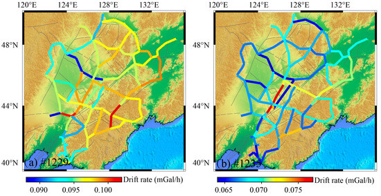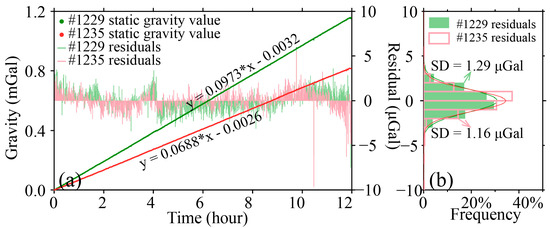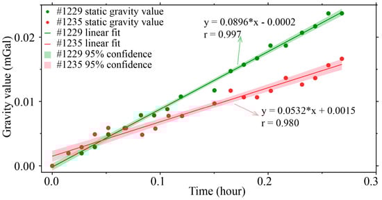 Based on continuous stable observational data (≥10 min per station), this study investigated drift characteristics under mobile survey conditions. At the Shenyang site (ID: 10112500) on 2 October 2015 (Figure 3), dynamic drift rates of 0.0896 mGal/h (#1229) and 0.0532 mGal/h (#1235) were observed. Linear regression analysis yielded high correlation coefficients (r = 0.997 for #1229; r = 0.980 for #1235), with residual standard deviations of 1.8 μGal and 2.7 μGal, respectively, confirming robust reliability of the drift models.