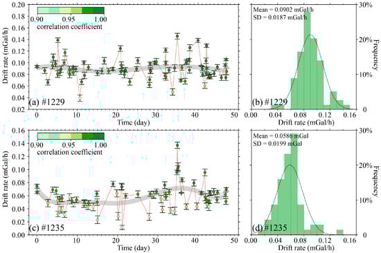 Extending this methodology to 48-day network-wide data, drift rates were filtered using thresholds of r > 0.9 and σ < 5 μGal (Figure 4). Key findings include the following: (1) dynamic drift time series exhibited pronounced spatiotemporal variability, with nonlinear oscillation amplitudes reaching Δk = 0.1064 mGal/h (#1229) and Δk = 0.1256 mGal/h (#1235), while smooth temporal trends remained negligible; (2) a statistical analysis revealed that dynamic drift rates for both instruments followed normal distributions—N(0.0902,0.01872) for #1229 and N(0.0586,0.01992) for #1235; (3) mean dynamic drift rates decreased by 7% (#1229) and 15% (#1235) compared to static conditions.