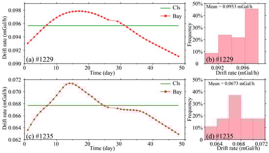 Drift rate estimations from the classic adjustment model and the Bayesian adjustment model. (a) Drift rate estimations of #1229. (b) Statistical results of the drift rate estimated using the Bayesian model for #1229. (c) Drift rate estimations of #1235. (d) Statistical results of the drift rate estimated using the Bayesian model for #1235.