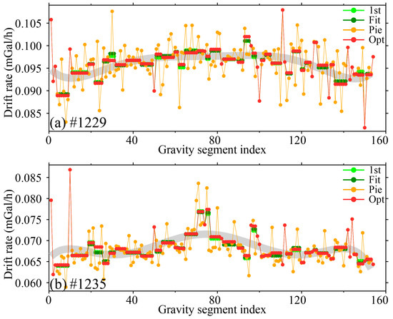 Figure 6 illustrates drift rate distributions across gravimetric line models. Under single-segment conditions, all models produced consistent estimates. For multi-segment configurations, the maximum mean drift rate differences between the initial-point (1st), line-fitting (Fit), and variance-sum optimal (Opt) models were 0.0016 mGal/h (#1229) and 0.0014 mGal/h (#1235). The piecewise linear model (Pie) displayed the highest dispersion, with drift rate ranges spanning 0.0714–0.1079 mGal/h (#1229) and 0.0422–0.0869 mGal/h (#1235), reflecting its sensitivity to localized environmental noise.