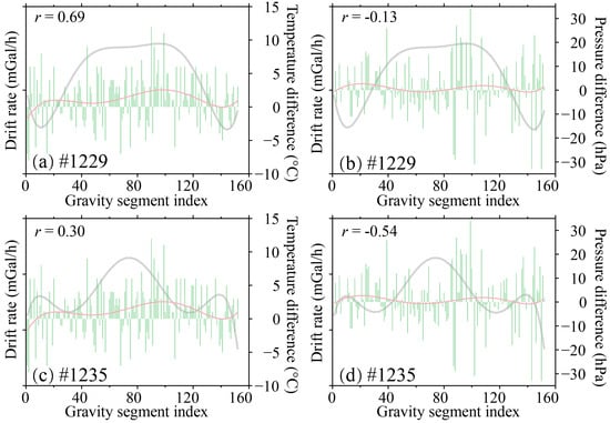 Correlation between dynamic drift rate variations and temperature/pressure fluctuations. (a) Correlation between the drift rate variation of #1229 and temperature fluctuations. (b) Correlation between the drift rate variation of #1229 and pressure fluctuations. (c) Correlation between the drift rate variation of #1235 and temperature fluctuations. (d) Correlation between the drift rate variation of #1235 and pressure fluctuations. The gray solid line represents the fitted results of the drift rate variation, while the red solid line represents the fitted results of temperature/pressure fluctuation.