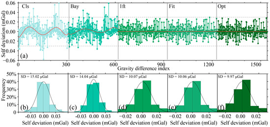 Self-difference distribution between the adjustment model and the symmetric observation model of gravimetric lines. (a) Self-difference distribution. (b) Self-difference statistical results of the Cls model. (c) Self-difference statistical results of the Bay model. (d) Self-difference statistical results of the 1ft model. (e) Self-difference statistical results of the Fit model. (f) Self-difference statistical results of the Opt model.