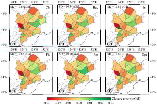 Closed-loop difference distribution for the adjustment model and the symmetric observation model of gravimetric lines. (a) Closed-loop difference distribution of the Cls model. (b) Closed-loop difference distribution of the Bay model. (c) Closed-loop difference distribution of the 1st model. (d) Closed-loop difference distribution of the Fit model. (e) Closed-loop difference distribution of the Pie model. (f) Closed-loop difference distribution of the Opt model.