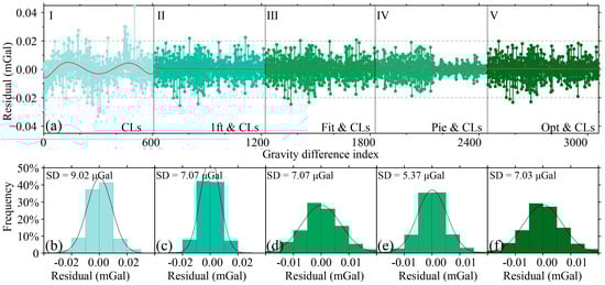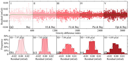 Figure 11 illustrates the segment residual distribution of the classical adjustment model. Raw residuals from the standalone CLS model (Figure 11a, panels I–V) exhibited significant systematic biases linked to nonlinear drifts, yielding a residual standard deviation of 9.02 μGal. Preprocessing with symmetric observation models reduced residuals to 5.37–7.07 μGal, showing spatially random distributions. The piecewise linear model achieved the lowest residual standard deviation (σ = 5.37 μGal), followed by the variance-sum optimal model (σ = 7.03 μGal). The Bayesian adjustment model (Figure 12) outperformed the classical method, achieving a standalone residual standard deviation of 7.97 μGal (12% reduction). Hybrid schemes further enhanced the performance: the piecewise linear-Bayesian combination yielded the lowest residuals (σ = 4.88 μGal), while the variance-sum optimal-Bayesian hybrid ranked second (σ = 6.89 μGal).