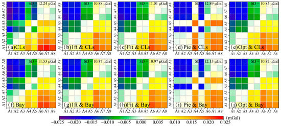 Figure 13 presents cross-validation results using an absolute gravity datum (stations A1–A8: Changchun, Binxian, Changling, Ulanhot, Suiyang, Changbai Mountain, Shenyang, Hegang). The classical adjustment exhibited a maximum deviation of Δmax = 23.62 μGal, whereas the Bayesian adjustment achieved Δmax = 21.51 μGal. Despite superior segment residual performance, the piecewise linear model showed the largest absolute datum cross-validation standard deviations (σ = 12.89 μGal for CLS, σ = 12.13 μGal for BAY), attributed to error misallocation—erroneously treating observational noise () as drift () in the decomposition . In contrast, the figure demonstrates that hybrid schemes combining symmetric observation models (initial-point, line-fitting, and variance-sum optimal) with adjustment methods (CLS or BAY) consistently yield lower cross-validation standard deviations (indicated by SD values in each panel) compared to standalone adjustment models, with the variance-sum optimal-Bayesian hybrid (Figure 13j) showing the most significant improvements in aligning with absolute gravity datums. The variance-sum optimal-Bayesian hybrid model synergized two mechanisms: local variance minimization to suppress segment-scale drift errors, and global Bayesian optimization to refine network-wide residuals via temporal correlation priors. This combined approach achieved 12% and 6% reductions in absolute datum cross-validation standard deviations compared to the standalone CLS and BAY models, respectively. This dual-scale correction framework validates its unparalleled precision for μGal-level gravity signal extraction in dynamic field environments.