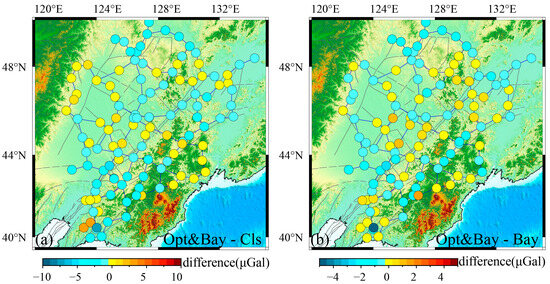 Gravity value deviations between the optimal Bayesian-combined adjustment model and the classic/Bayesian adjustment models. (a) Gravity value deviations between the Opt&Bay combined model and the Cls model. (b) Gravity value deviations between the Opt&Bay combined model and the Bay model.