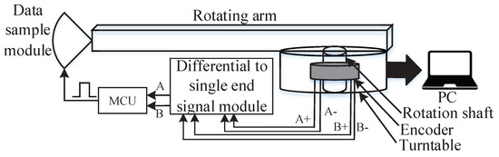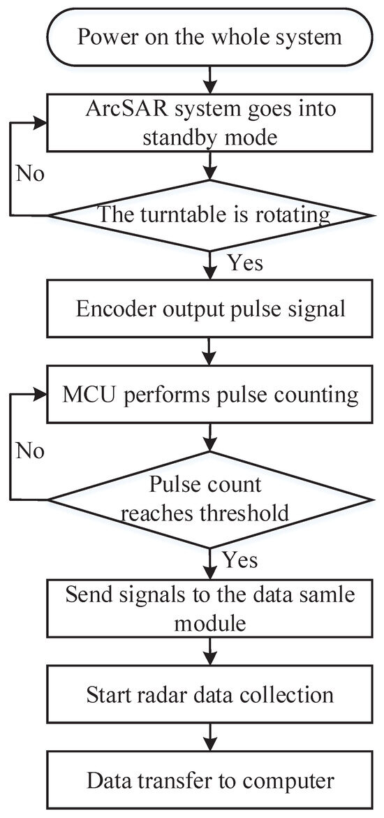 The overall workflow of the ArcSAR system is shown in Figure 1. After the system is powered on and initialized, the motor starts to rotate, and the microcontroller unit (MCU) counts the pulses from the angular coder. The rotation angle between every two consecutive pulses is constant. During the process of counting the output pulses from the angular coder, a trigger signal is sent to the radar when the counted number meets a threshold. The external pin reserved in the mmwave radar data module is used to receive the trigger signal. Upon receiving the signal, the radar works once to ensure uniform sampling of the radar data in the spatial angular domain. Finally, the collected data are uploaded to the PC. Each part is discussed in detail below.