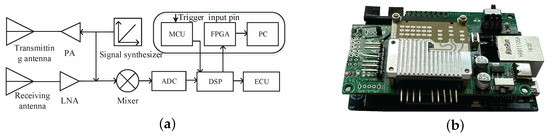 The mmwave radar module utilizes the IWR6843 millimeter-wave radar from Texas Instruments (TI) as the radar sensor, operating in the 60 GHz band, with a maximum signal bandwidth of 4 GHz. A schematic diagram of the basic composition of the mmwave radar module is shown in Figure 2a. The radar system employs a power amplifier (PA) and a low-noise amplifier (LNA) to amplify the transmitted and received signals, respectively. A mixer performs a conjugate multiplication of the signals from the transmission and reception antennas, producing an intermediate frequency (IF) signal, which is then converted to a digital signal by an analog-to-digital converter (ADC) unit. The MCU is programmed using the Keil5 development environment, which enables it to issue commands to start or stop the radar via a serial port to the digital signal processor (DSP). If the radar is activated, the DSP’s data transmission port sends the radar data to the field-programmable gate array (FPGA). After receiving the data, the FPGA transmits them in real time to the PC via an Ethernet interface for analysis and processing, enabling SAR imaging. An external trigger capability has been developed for the millimeter-wave radar sensor, with a dedicated external trigger pin that allows it to receive trigger signals from an external source. The data acquisition module is depicted in Figure 2b. The module is compact in size, has low power consumption, and offers stable operational performance, making it well suited for application in building monitoring in a city scenario.