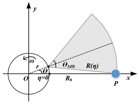 Figure 4 shows the geometry of the ArcSAR. The rotation center is O, the rotation radius is r, the radar is located at the end of the arm, and the synthetic aperture is circular in shape. The rotation speed is , the azimuth slow time is , and the coordinates of the point target P are . The point is set to P due to the rotation invariant feature of the ArcSAR. The distance from the point target P to the rotation center is . The range equation is expressed as follows:
