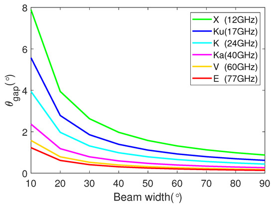 When the rotation radius is m and is set to X, Ku, K, and other bands, the maximum angular sampling interval versus azimuth beam width is as depicted in Figure 6. Qualitatively, it can be observed that, across different bands, as the radar beamwidth increases, a smaller should be set. Equation (31) is applicable to radars operating in various frequency bands.