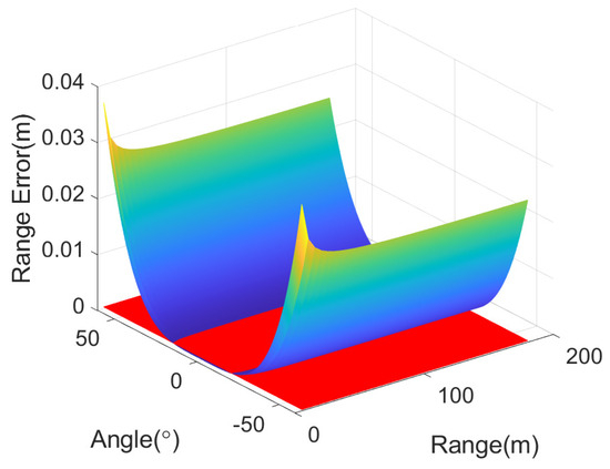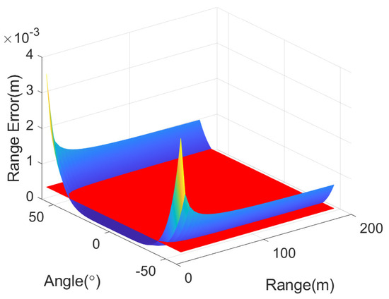 The range error of the fourth-order range model varying with the range and azimuth angles. The red plane is the threshold of the required range error.