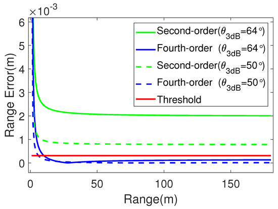 With a carrier frequency of 60 GHz, a beamwidth of 64°, and a rotating radius of m, the maximum angular sampling interval is calculated to be . Next, the range error versus the target range and azimuth beamwidth can be analyzed using the second- and fourth-order range equations, respectively. The range errors of the second- and fourth-order range models, which vary with the range and azimuth angles, are shown in Figure 7 and Figure 8, represented by a gradient surface, where the red plane represents the threshold value of . It can be observed that, under the fourth-order model, the applicable space of the range and beamwidth is larger. The second- and fourth-order range model curves, with beamwidths of 64° and 50°, are selected, as shown in Figure 9. It is evident that the second-order range model does not meet the accuracy requirements of the slant range error when the beamwidth is 64° and that the improved fourth-order RD algorithm meets the slant range error condition when the target distance is larger than 12.7771 m. Assuming a beamwidth of 50°, the improved fourth-order RD algorithm remains unaffected when the distance from the point target to the rotation center is m. Therefore, it can be concluded that the algorithm is affected by the wide beam, and, as the beamwidth increases, the applicable range of the distance decreases.
