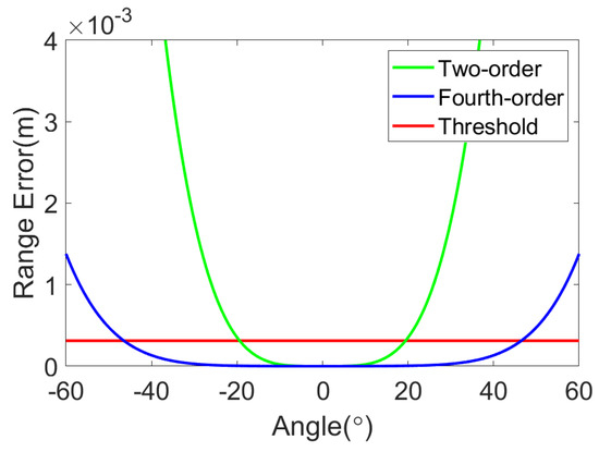 The current method holds a uniform angular sampling assumption. This subsection presents an analysis of the imaging error caused by the approximation order of the range equation. The expression of is as follows: