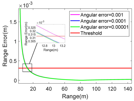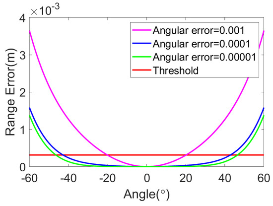 The range error of the improved RD algorithm varying with the range when adding angular errors with ranges of , , and .