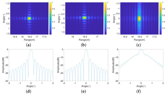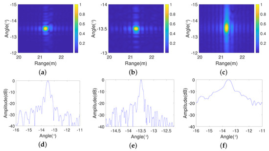 Finally, to validate the maximum angular sampling interval, experiments were conducted using different angular sampling intervals. Figure 19a–c show the frequency domains of the different angular sampling intervals, where it can be observed that the sampling interval increases, and Figure 19c presents the maximum sampling interval, with the two yellow lines labeling the spectral width. Figure 19d,e show the corresponding imaging results for the different angular sampling intervals. It can be observed in Figure 19a–c that the signal spectra broaden as the angular sampling interval increases, which validates the deduced Equation (31).