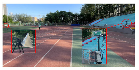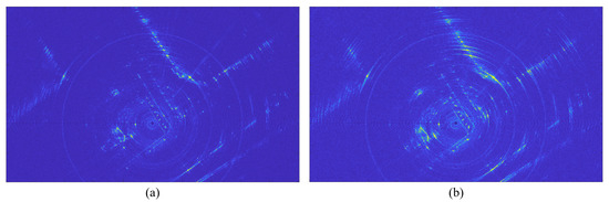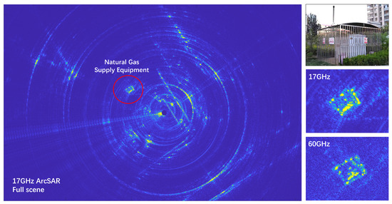 To further illustrate the advantage of the proposed system, a comparative experiment with the 17 GHz ArcSAR system is conducted in the same area. A photo of the system is shown in Figure 25. It is developed by our team, and it is a RiskRadar-360-type system. The system works in the Ku band (17 GHz), with a maximum bandwidth of 1 GHz and a maximum imaging range of 5 km. The rotation arm’s length is 0.75 m, and the azimuth beamwidth is . To obtain images under similar conditions, the bandwidth is set to 800 MHz, and the maximum range is set to 200 m. The obtained image is shown in Figure 26.