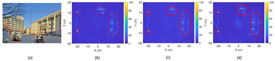 Figure 24 shows the scene 3 imaging results of the BP (a) and traditional RD algorithms (b). Compared with Figure 23, the BP and improved RD algorithms have a similar imaging quality, determined by looking at the mainlobe of the building’s edge in area A. Conversely, the traditional RD still does not output good imaging results, thus demonstrating the proposed method’s effectiveness.