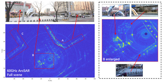 Areas A and C represent the right-side buildings and the shopping mall, respectively, and the edge of the bottom of these buildings can be seen clearly. Their vertical planes are not very clear, which is because the radar is on the ground. To obtain the vertical plane of tall buildings, the data observation geometry needs to be optimized when installing the ArcSAR system. As the current ArcSAR is a 2D imaging system, to image 3D buildings, a new ArcSAR with 3D imaging capabilities needs to be developed. This can be achieved by installing the radar module vertically so that multi-baseline data alongside height can be acquired to form a 3D image.