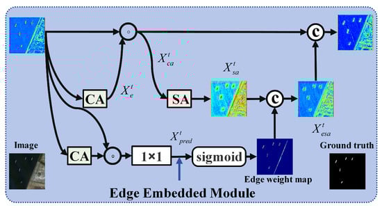 In the edge embedding module, the channel attention mechanism is used to assign different weights to each channel to highlight the channels that are most critical for target detection. Specifically, the channel attention module computes the average value of each channel through a global average pooling operation to generate a global feature descriptor. This descriptor is tuned by a learnable weight matrix and a sigmoid activation function is used to generate weights for each channel. This operation can dynamically adjust the network’s attention according to the feature importance of different channels, which helps the network to extract the most significant target features among the multi-scale features. After adjusted by channel attention and spatial attention, the input feature maps are fused and output the final prediction results , which are fused as follows: