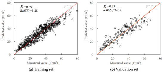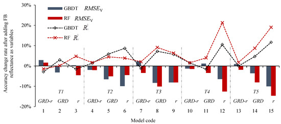 (3) For the single-stage prediction, the GBDT model built at the T3 stage using WDRVI, NGBDI, and TDVI achieved the highest accuracy ( = 0.77 and RMSEV = 7.63 t/hm2).