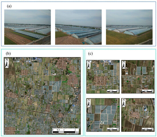 Real-world plastic greenhouses and their representations in remote sensing imagery. (a) Real-world plastic greenhouses; (b,c) plastic greenhouses on remote sensing images at varying scales.