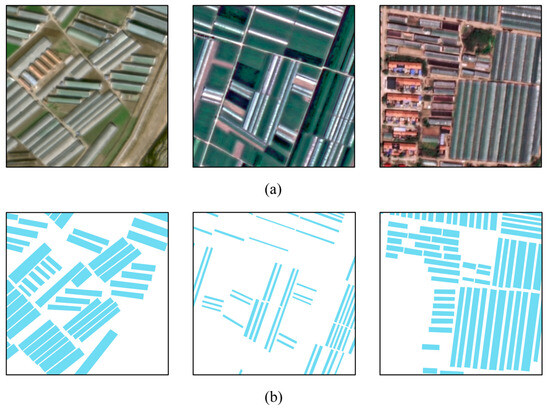 Representative greenhouse typologies observed in Weifang City’s remote sensing imagery. (a) Plastic greenhouses with varying distribution densities and morphological features in remote sensing images. (b) The label corresponding to the plastic greenhouse in (a).