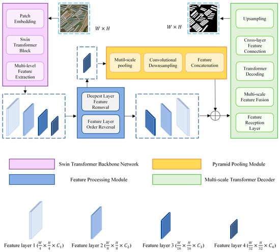 The proposed MTDSNet architecture is illustrated in Figure 5. The network builds upon the Swin-UNet framework, which integrates the powerful feature representation capabilities of the Swin Transformer within a U-shaped architecture originally designed for medical image segmentation tasks [29,30]. Our model retains the classical encoder–decoder structure of U-Net while incorporating a shifted window-based Swin Transformer as the backbone for hierarchical feature extraction. To satisfy the hierarchical feature requirements of the Multi-scale Transformer Decoder (MTD) module, the final-layer features extracted by the Swin Transformer are passed through a Pyramid Pooling Module (PPM) to enhance global contextual understanding. Simultaneously, the intermediate features from the remaining layers are reorganized from a shallow-to-deep to a deep-to-shallow sequence. These multiscale features are then fed into the MTD module, where learnable attention weights are used to achieve dynamic and adaptive feature fusion. This architectural design improves the compatibility between high-level semantic features and low-level spatial details, while avoiding redundancy with features generated by the PPM. Additionally, it mitigates the risk of losing fine-grained information due to the overwhelming influence of high-level abstract features.