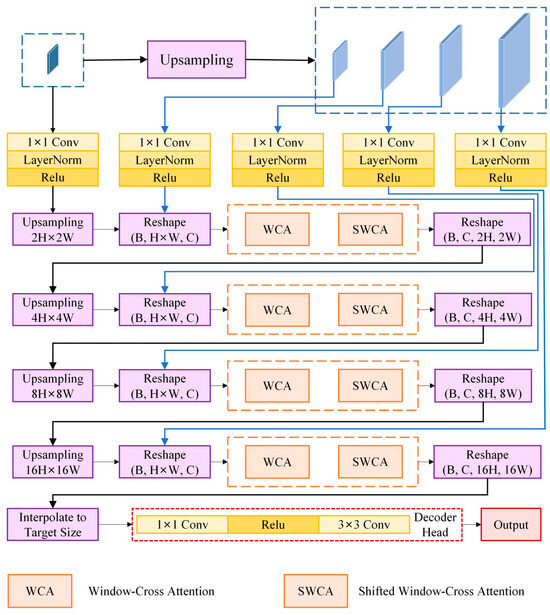 Stage 1: The module receives two feature inputs—deepest-level features processed by the Pyramid Pooling Module (PPM) and reversed feature maps from shallower layers. These are upsampled to generate feature maps at multiple resolutions: 2H × 2W, 4H × 4W, 8H × 8W, and 16H × 16W (where H and W denote the original height and width, respectively). Feature Map 1 is processed through lateral convolution and upsampled to 2H × 2W resolution. It is then reshaped into a tensor of shape (B, H × W, C), where B is the batch size, and C is the number of channels. This reshaped map is further refined using Window-Cross Attention and Shifted Window-Cross Attention mechanisms and subsequently reshaped back to (B, C, 2H, 2W). This stage emphasizes small-object sensitivity via multi-scale attention fusion.
