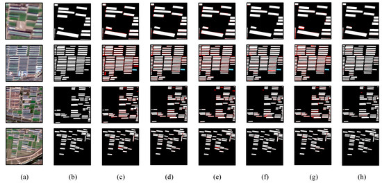 Partial test results on the IPG dataset. (a) GF-2 remote sensing image; (b) corresponding labels for individual plastic greenhouses; (c) UperNet; (d) CPS-RAUnet++; (e) UNet; (f) UNETR++; (g) Swin-UNet; (h) MTDSNet.